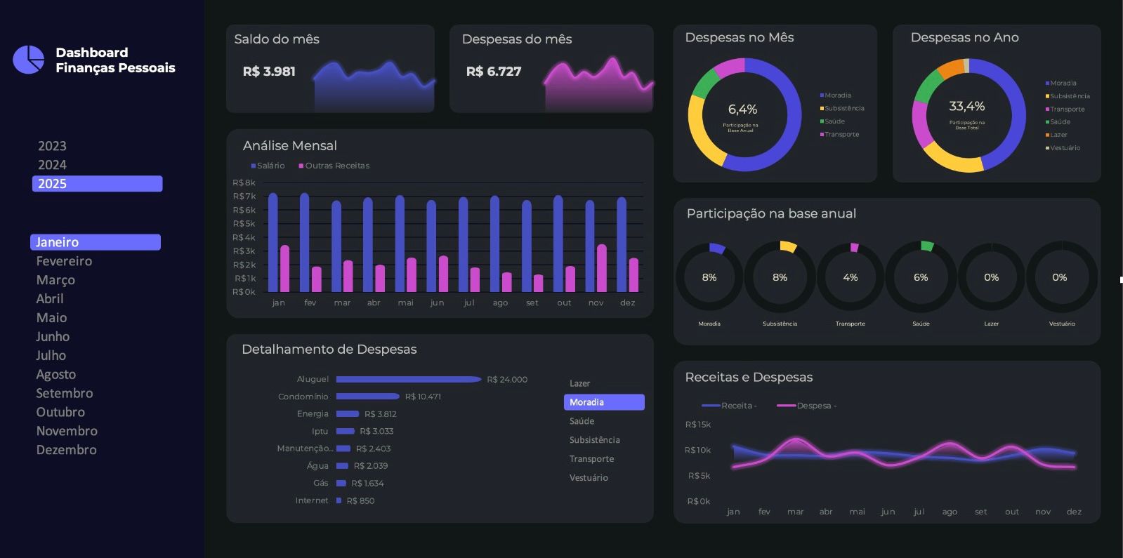 Com uma estrutura intuitiva e visual, o dashboard permite acompanhar receitas, despesas, investimentos, metas financeiras e fluxo de caixa em um único lugar, facilitando a tomada de decisões e proporcionando mais clareza sobre sua vida financeira.